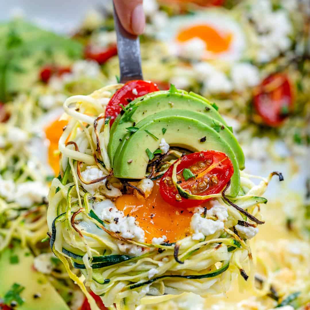Easy egg breakfast recipe baked in with zoodles, tomatoes, and feta cheese, and then topped with sliced avocados.