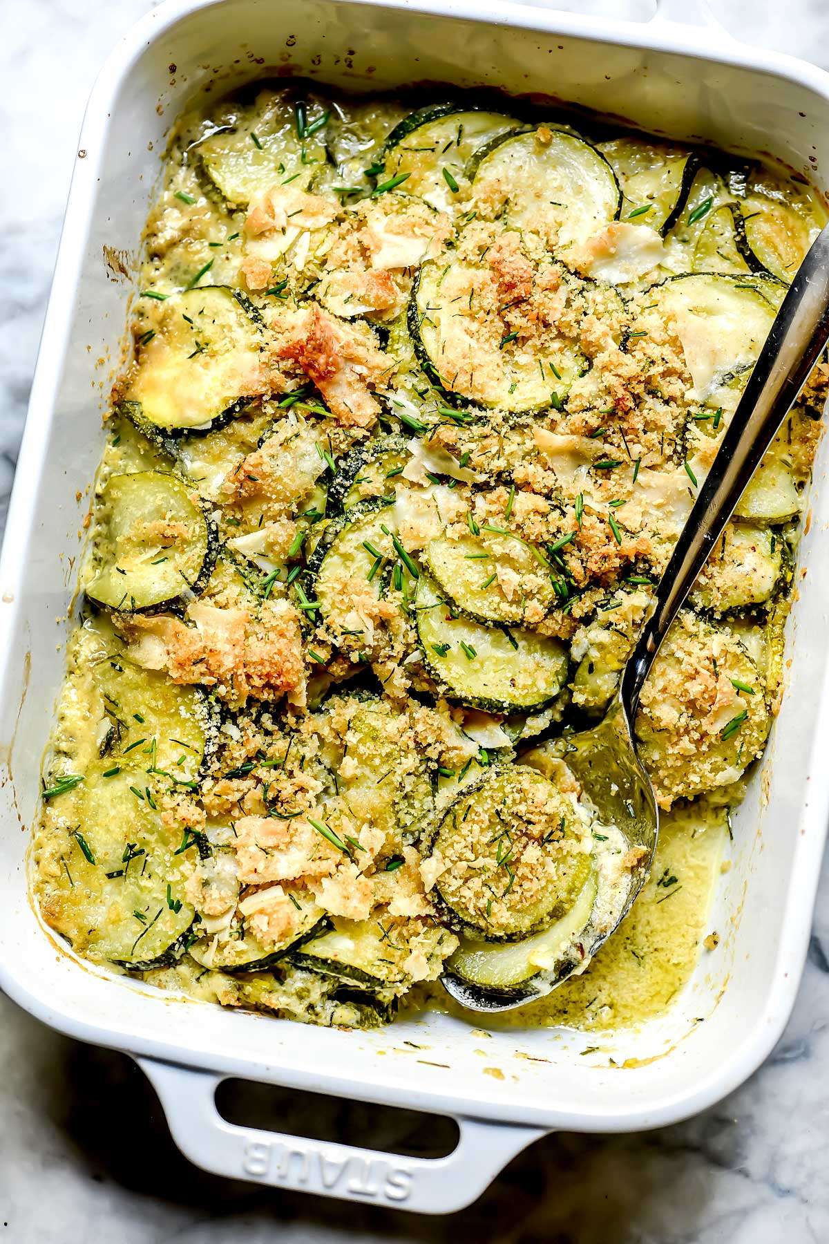 - Spray a 7 X 11-inch or 2-quart baking dish with cooking spray, then transfer the zucchini mixture to the dish. In a small bowl, combine the bread crumbs with the remaining melted butter and Parmesan cheese, plus the remaining chopped chives. Sprinkle the bread crumb mixture evenly over the zucchini. Cover with foil and bake until warmed through and the cheese has started to melt, about 15-20 minutes. Remove the foil and raise the oven temperature to 450°F. Bake until the top is browned and the filling is bubbling at the edges, about 10 minutes. Sprinkle with more fresh chives if desired, and serve.