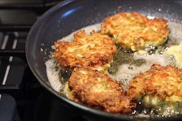 - Heat oil in a large frying pan on medium. Once heated, drop batter in by heaping tablespoonfuls. Let cook until golden brown and then flip. (Turn heat to medium low if they are browning too fast, they should be golden by the time they are cooked half through and ready to flip). Once done, drain on paper towel lined plate or bowl in a warm oven until they are all cooked, 2 or 3 batches. (Makes 12 fritters)