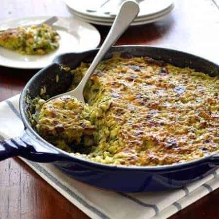 The real name of this dish is Tian de Courgettes au Riz (Zucchini Tian) and it is a Julia Child recipe. It is like a cross between a gratin and risotto. You will be amazed by how creamy this cream-less, butter-less dish is, yet has only 250 calories per serving (as a main).